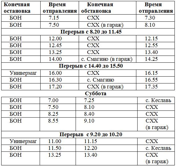 Примечание: по просьбе жителей в будние дни добавлен рейс в 13.25 от БОНа и в 13.40 от СХХ, последний рейс от БОНа по будням будет отправляться в 17.20, а не в 17.00, от СХХ – в 17.35. В субботу добавлен рейс в 13.25 от БОНа и в 13.40 от СХХ.