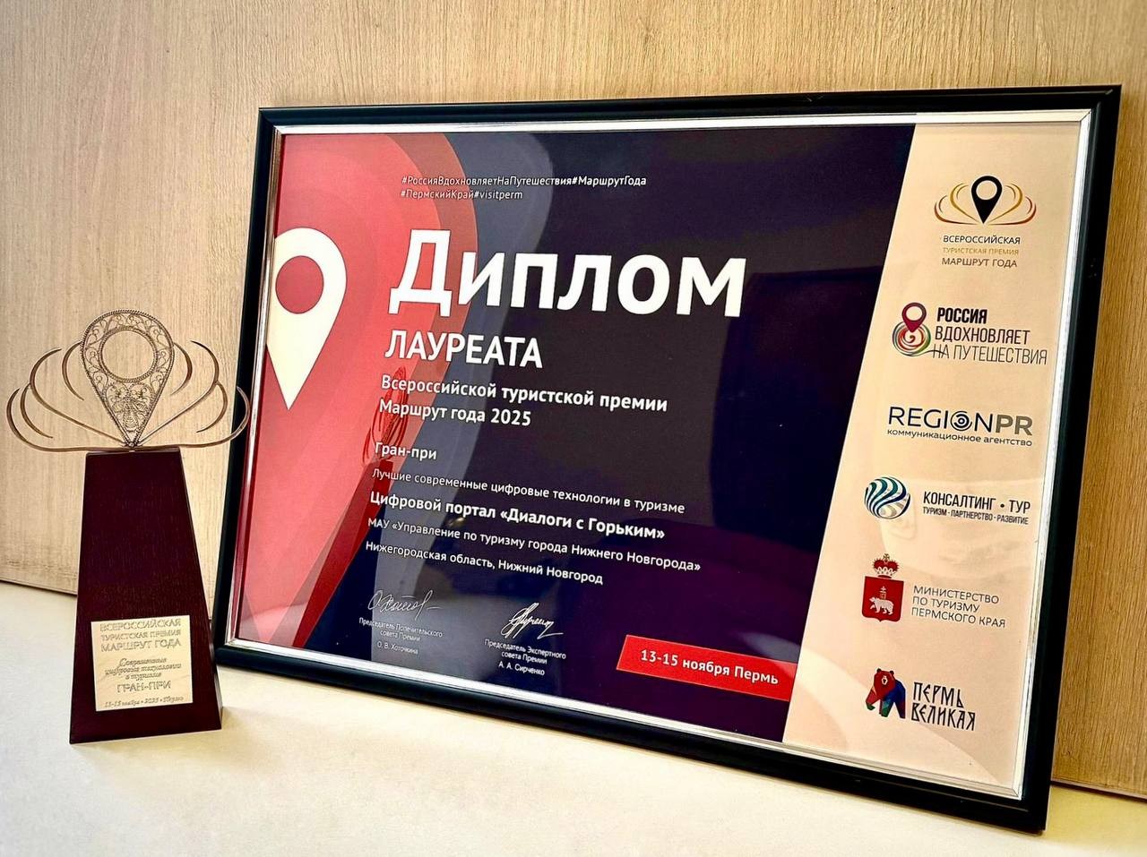 В номинации «Лучшие современные цифровые технологии в туризме» гран-при получил проект цифровой портал «Диалоги с Горьким». Он реализован управлением по туризму г. Нижнего Новгорода.