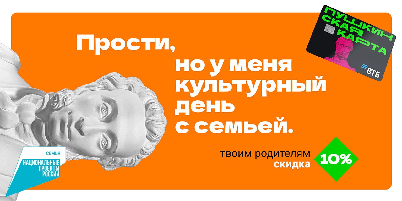 По условиям акции при покупке билета по «Пушкинской карте» посетитель получает скидку 10% на покупку двух билетов для своих родителей или других родственников. На кассе учреждения нужно показать электронный входной билет, купленный по «Пушкинской карте», и подтвердить личность, тогда можно получить два входных билета со скидкой.